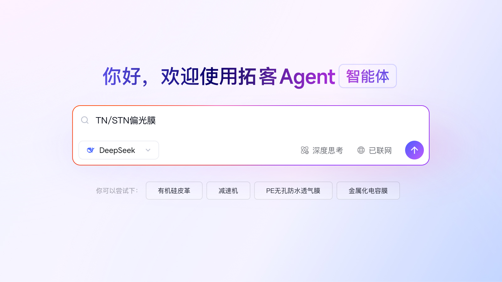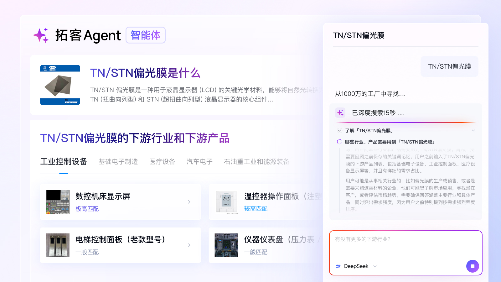 只需输入一个产品名称或型号(如TN/STN偏光膜),探迹拓客智能体就会通过自研的产业知识库与DeepSeek实时搜索引擎,深度解析该产品的功能、技术特性与应用场景,以最简单的方式输出最专业的行业知识。