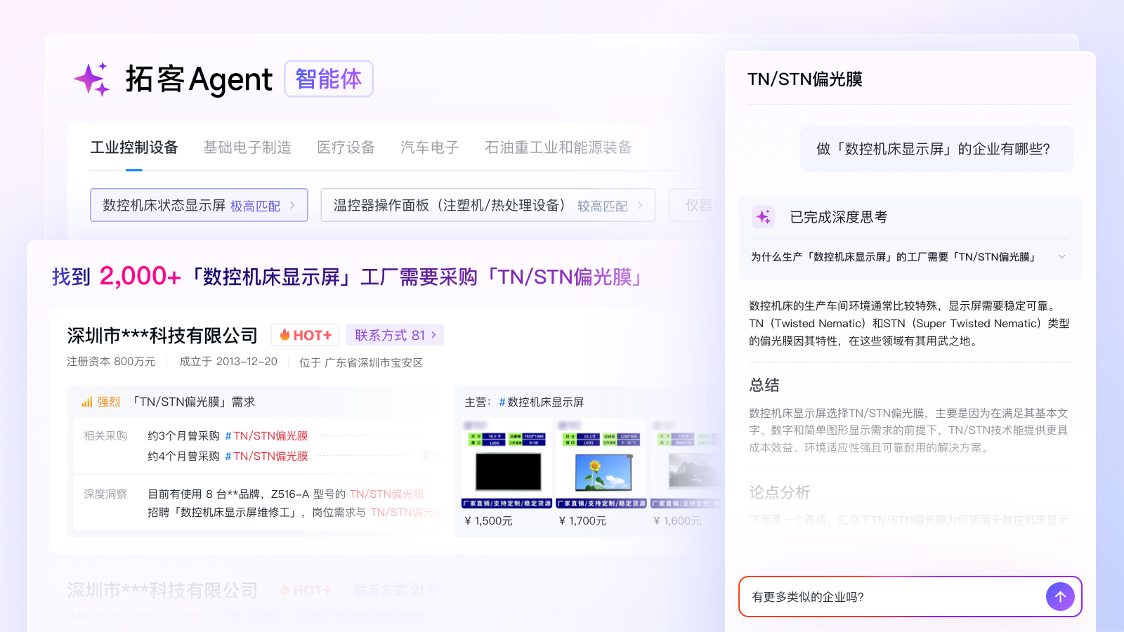 我们知道工业控制设备的工厂会需要用到TN/STN偏光膜这个产品,智能体不仅能迅速锁定工业控制设备工厂,还能结合采购经历把最具有"TN/STN偏光膜采购需求”的工厂排在前面,让你第一眼就能找到自己最适合的客户,真正实现重要客户优先跟进、线索资源高效分配。